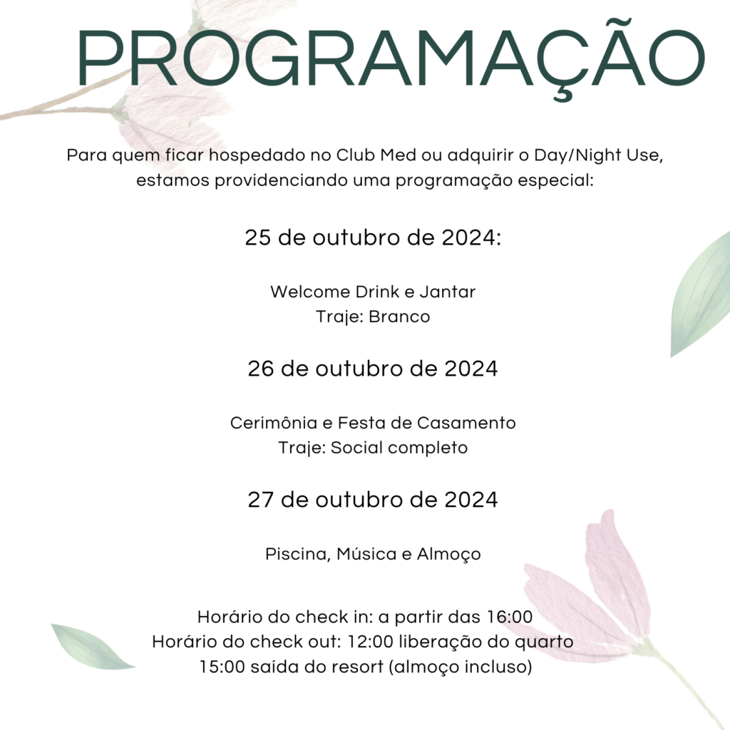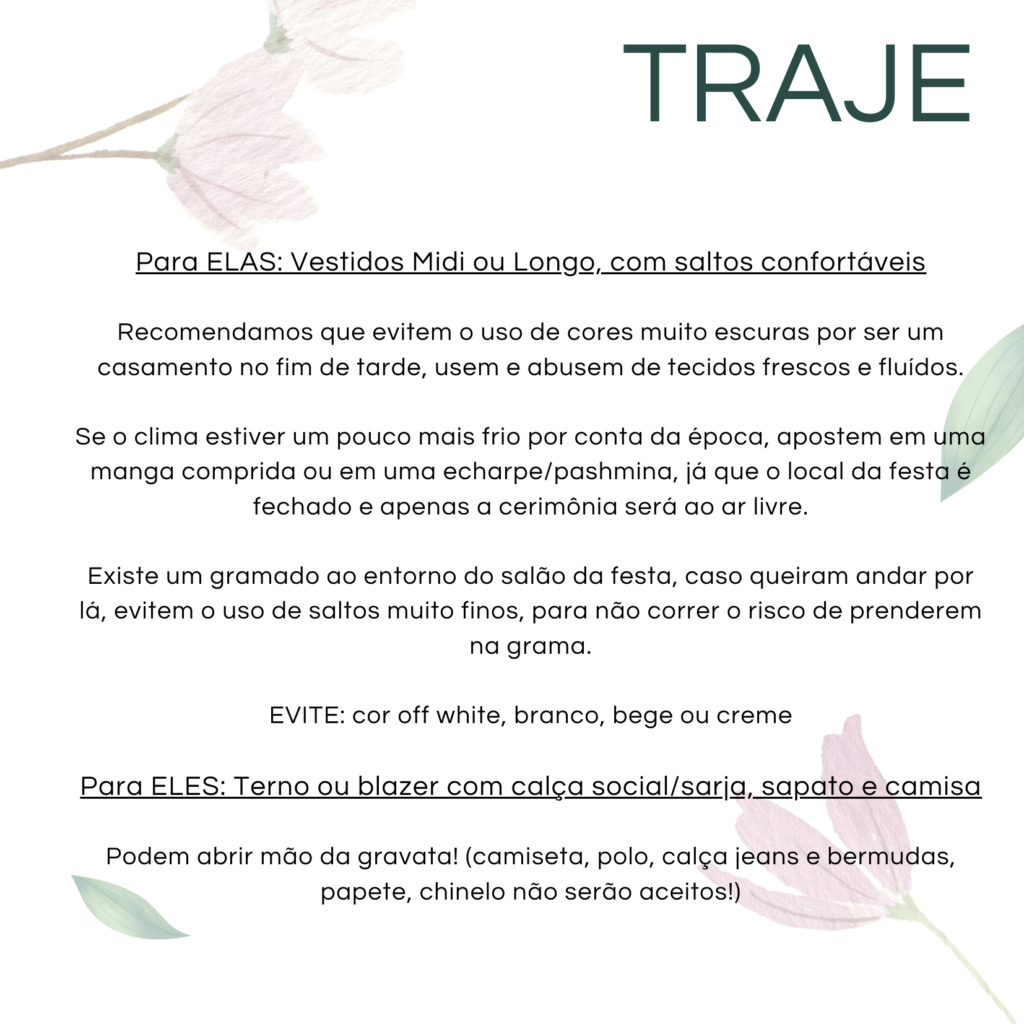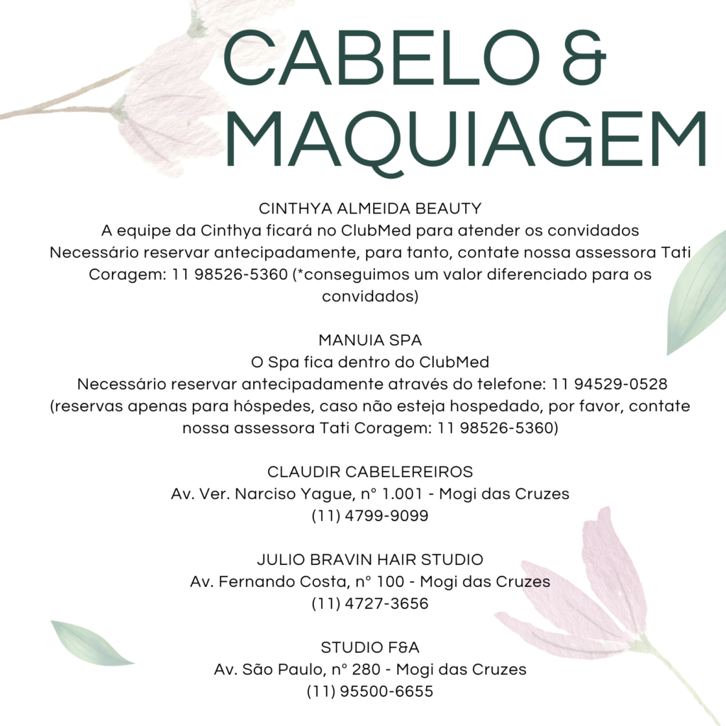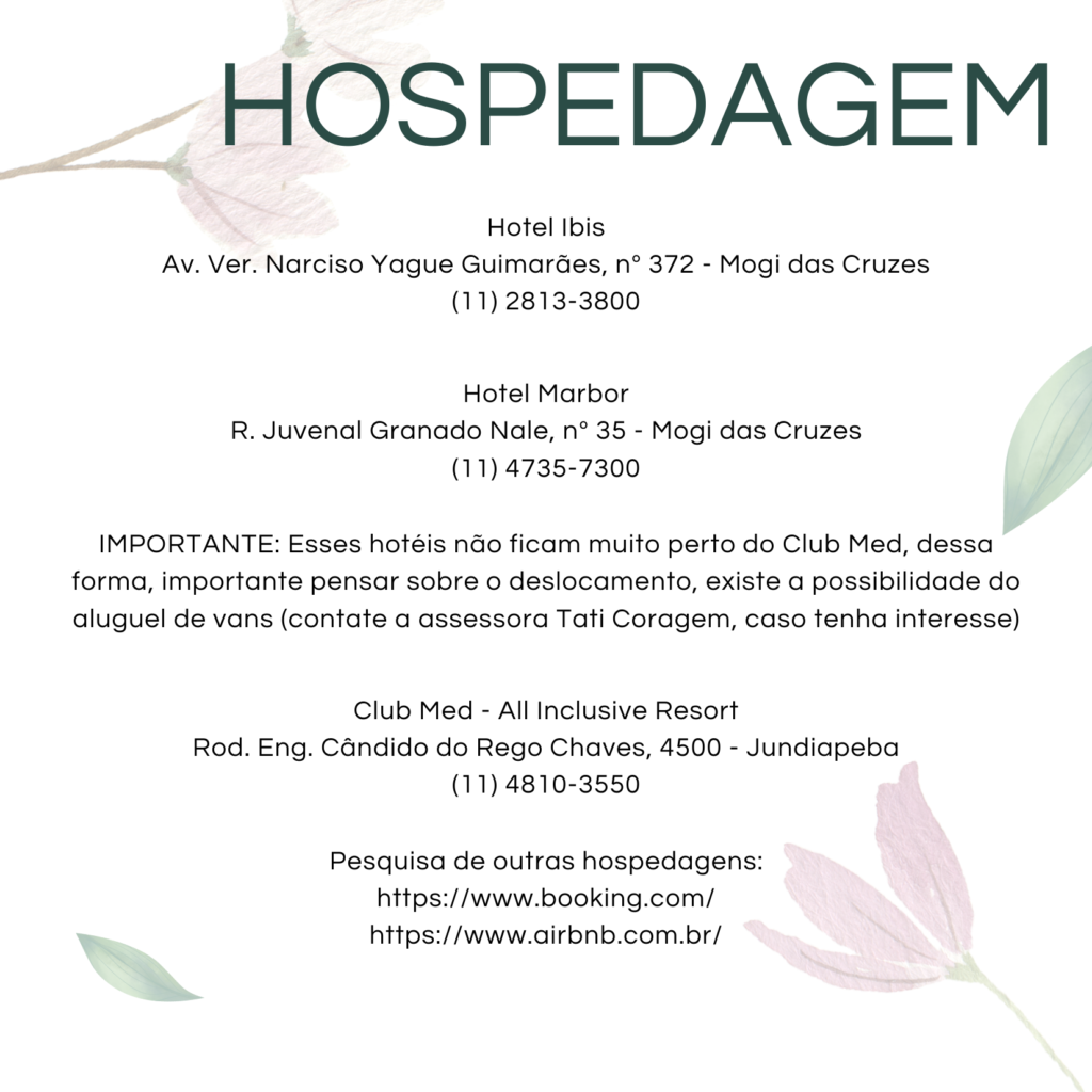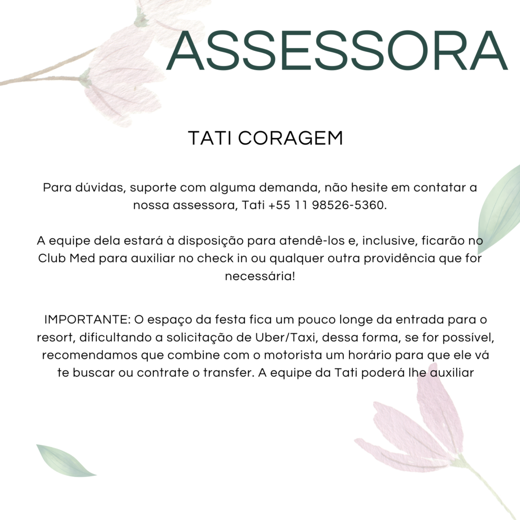 Dicas Nós preparamos diversas dicas e informações importantes para o nosso fim de semana! Lembrando que qualquer dúvida, podem falar com a gente ou com a nossa super assessora Tati Coragem +55 11 98526-5360 !